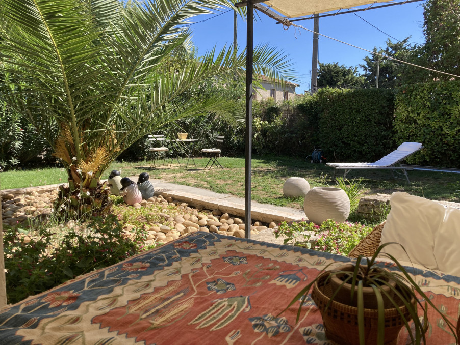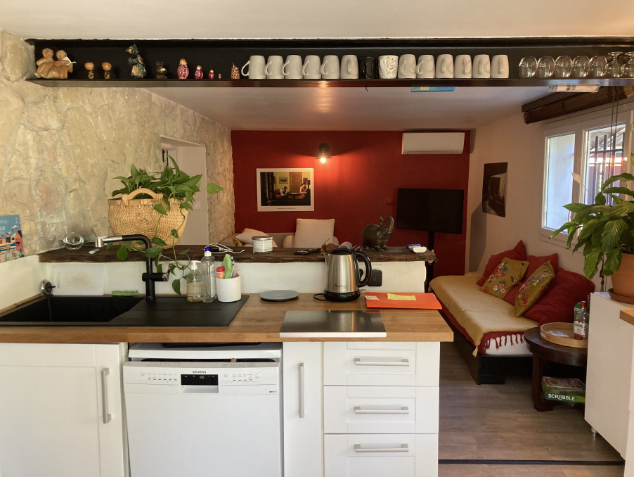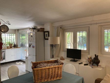 Terrasse couverte, séjour salon ouvert sur cuisine aménagée 37 m2, salle d'eau wc .