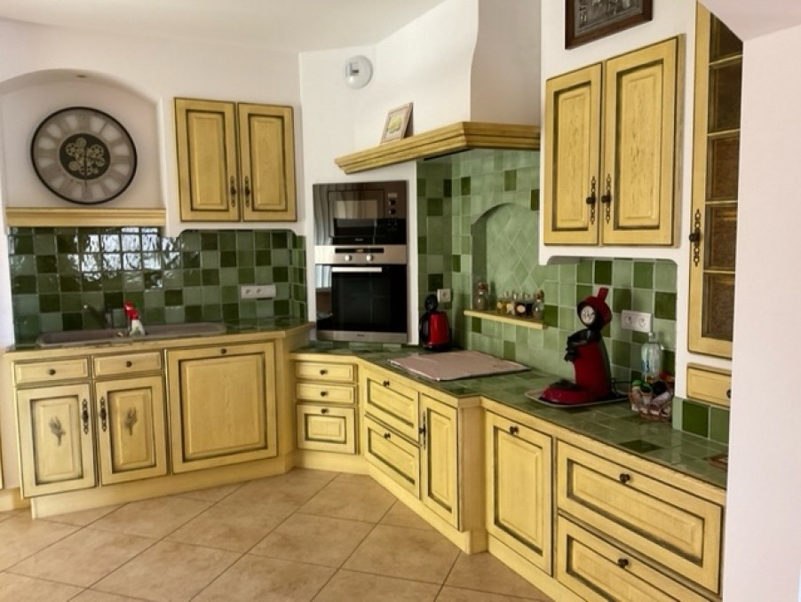 Vaste pièce de vie ouverte sur cuisine aménagée et équipée, accès direct sur buanderie et véranda .